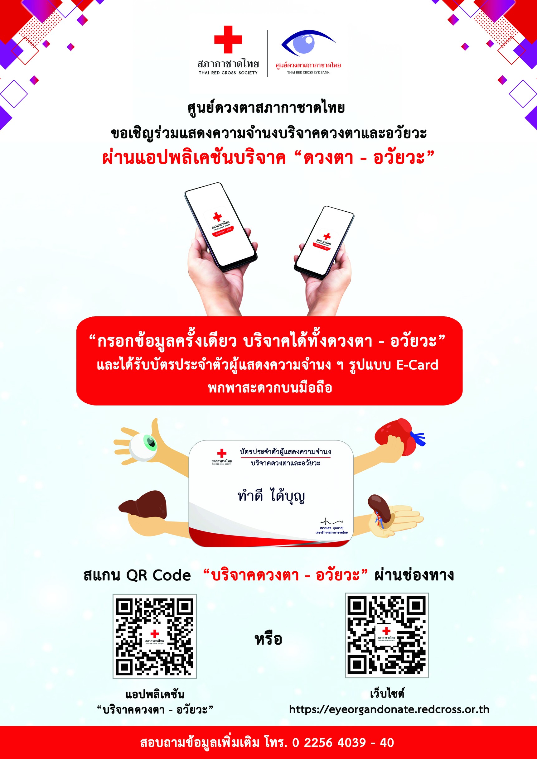 สำหรับผู้ที่สนใจสามารถร่วมแสดงความจำนงบริจาคดวงตาให้แก่สภากาชาดไทย ได้ 2 ช่องทาง ดังนี้ แอปพลิเคชัน “บริจาคดวงตา - อวัยวะ” และ เว็บไซต์ https://eyeorgandonate.redcross.or.th
