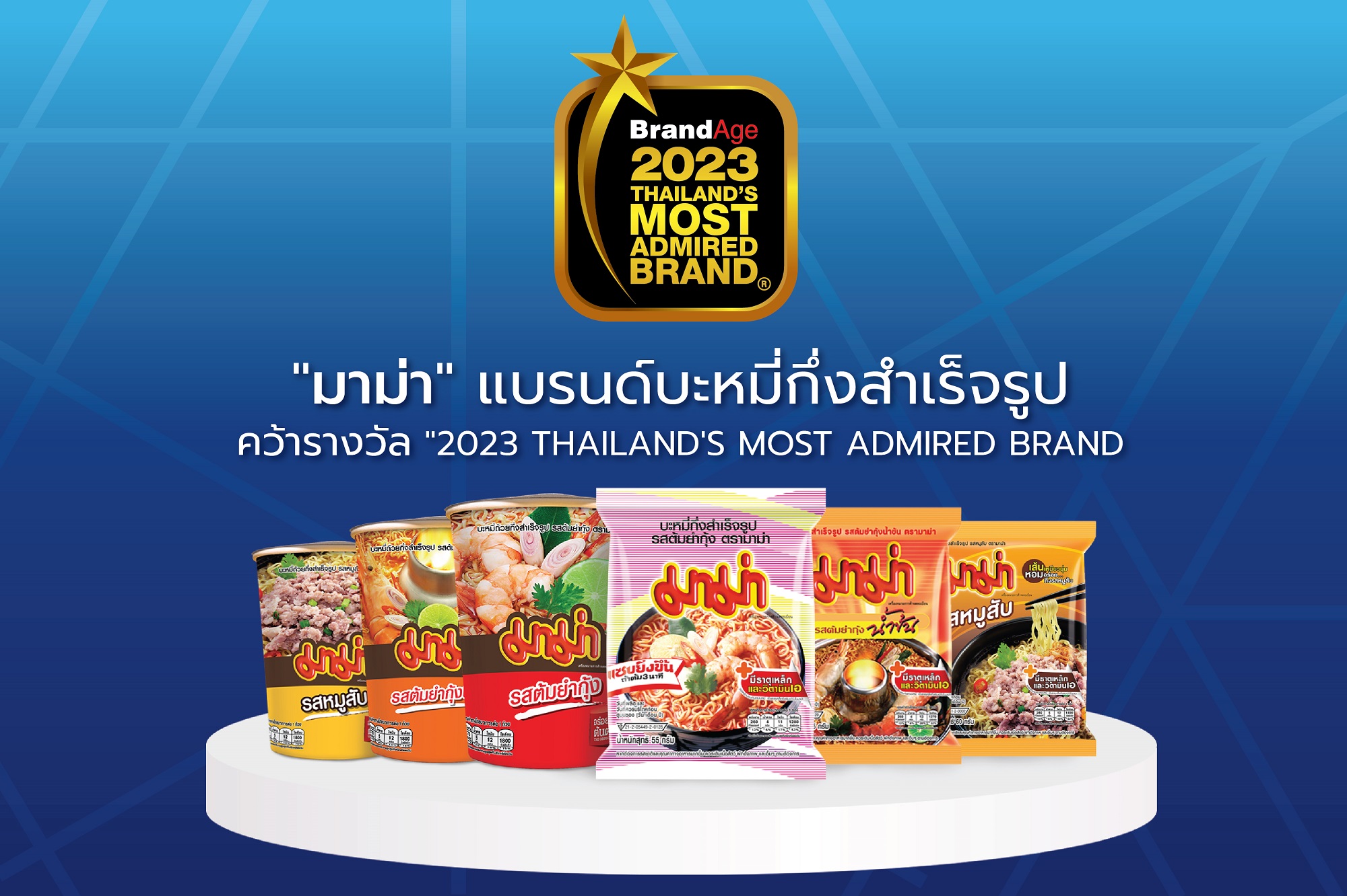 “มาม่า” ตอกย้ำแบรนด์บะหมี่กึ่งสำเร็จรูปที่ได้รับความไว้วางใจจากผู้บริโภคคนไทย คว้ารางวัล “2023 Thailand’s Most Admired Brand” หมวดอุปโภคและบริโภค กลุ่มบะหมี่กึ่งสำเร็จรูป ในงาน 2022-2023 Thailand’s Most Admired Company & 2023 Thailand’s Most Admired Brand พร้อมเดินหน้าพัฒนาผลิตภัณฑ์ที่มีคุณภาพ เพื่อสร้างคุณค่าและรสชาติที่ตอบโจทย์ความต้องการที่หลากหลายของผู้บริโภคทุกกลุ่ม