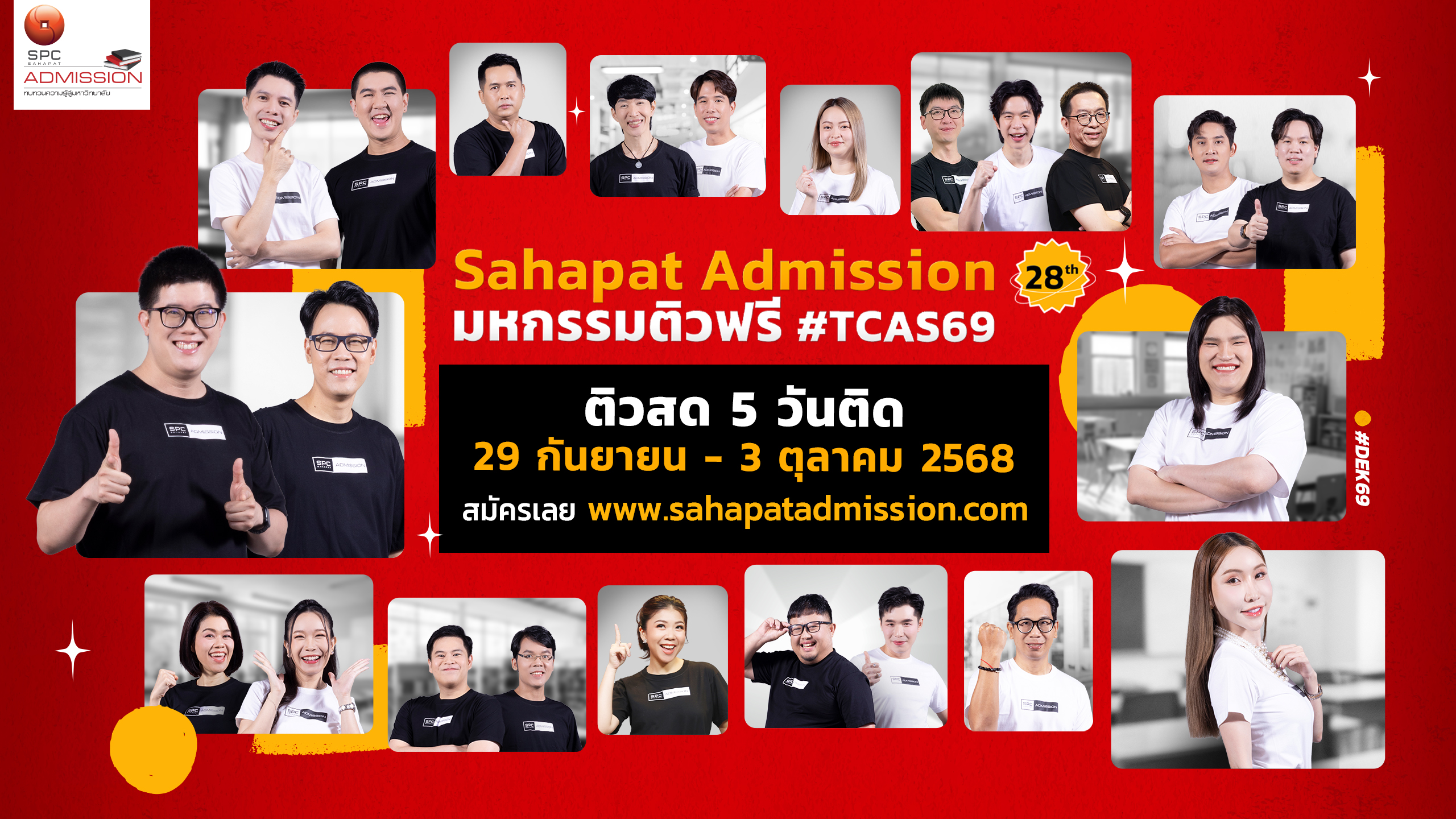 หลังจากกิจกรรมติวระดับภูมิภาค “Sahapat Admission On the Road 2025” ที่ทีมติวเตอร์ได้เดินสายไปทั่วประเทศตลอดเดือนสิงหาคมที่ผ่านมา โครงการ Sahapat Admission ขอเชิญชวนน้อง ๆ “#DEK69 วัยรุ่น TEST ดี” มาเตรียมพร้อมก่อนสอบครั้งสำคัญกับกิจกรรม “ติวสด 5 วันติด” ที่จะมีขึ้นระหว่างวันที่ 29 กันยายน – 3 ตุลาคม 2568 เวลา 09.00-16.00 น. ถ่ายทอดสดจาก บริษัท สหพัฒนพิบูล จำกัด (มหาชน) อาคารบางกอกทาวเวอร์ ห้อง Auditorium โดยมีการถ่ายทอดสัญญาณการติวไปพร้อมกันทั่วประเทศผ่านทางเว็บไซต์ www.sahapatadmission.com