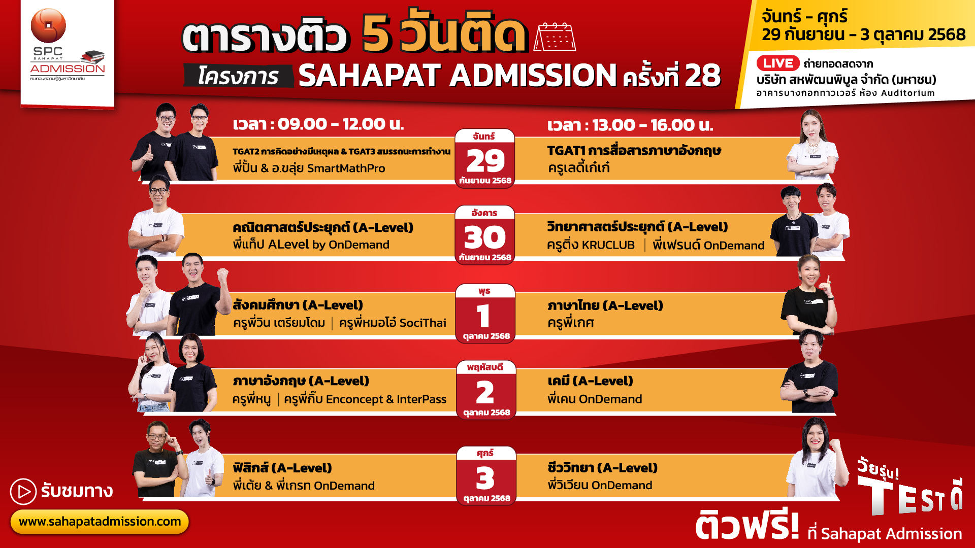 หลังจากกิจกรรมติวระดับภูมิภาค “Sahapat Admission On the Road 2025” ที่ทีมติวเตอร์ได้เดินสายไปทั่วประเทศตลอดเดือนสิงหาคมที่ผ่านมา โครงการ Sahapat Admission ขอเชิญชวนน้อง ๆ “#DEK69 วัยรุ่น TEST ดี” มาเตรียมพร้อมก่อนสอบครั้งสำคัญกับกิจกรรม “ติวสด 5 วันติด” ที่จะมีขึ้นระหว่างวันที่ 29 กันยายน – 3 ตุลาคม 2568 เวลา 09.00-16.00 น. ถ่ายทอดสดจาก บริษัท สหพัฒนพิบูล จำกัด (มหาชน) อาคารบางกอกทาวเวอร์ ห้อง Auditorium โดยมีการถ่ายทอดสัญญาณการติวไปพร้อมกันทั่วประเทศผ่านทางเว็บไซต์ www.sahapatadmission.com