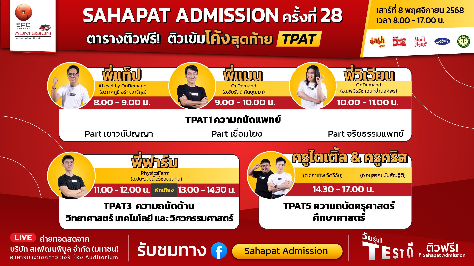 โครงการ “Sahapat Admission” ปีที่ 28 มหกรรมติวฟรีแห่งปี ที่เข้มข้น ครอบคลุมทุกเนื้อหาสำคัญ จัดโดยบริษัท สหพัฒนพิบูล จำกัด (มหาชน) หรือ SPC ร่วมกับผลิตภัณฑ์มาม่า บิสชิน มองต์เฟลอ ริชเชส และมูลนิธิ ดร.เทียม โชควัฒนา พร้อมส่งน้อง ๆ #DEK69 ให้ถึงฝั่งฝันกับกิจกรรม “ติวเข้มโค้งสุดท้าย TPAT” ในวันเสาร์ที่ 8 พฤศจิกายน 2568 เวลา 08.00-17.00 น. โดยถ่ายทอดสดจากบริษัท สหพัฒนพิบูล จำกัด (มหาชน) อาคารบางกอกทาวเวอร์ ห้อง Auditorium #DEK69 วัยรุ่น TEST ดี รับชมพร้อมกันทั่วประเทศได้ทาง Facebook Live: Sahapat Admission
