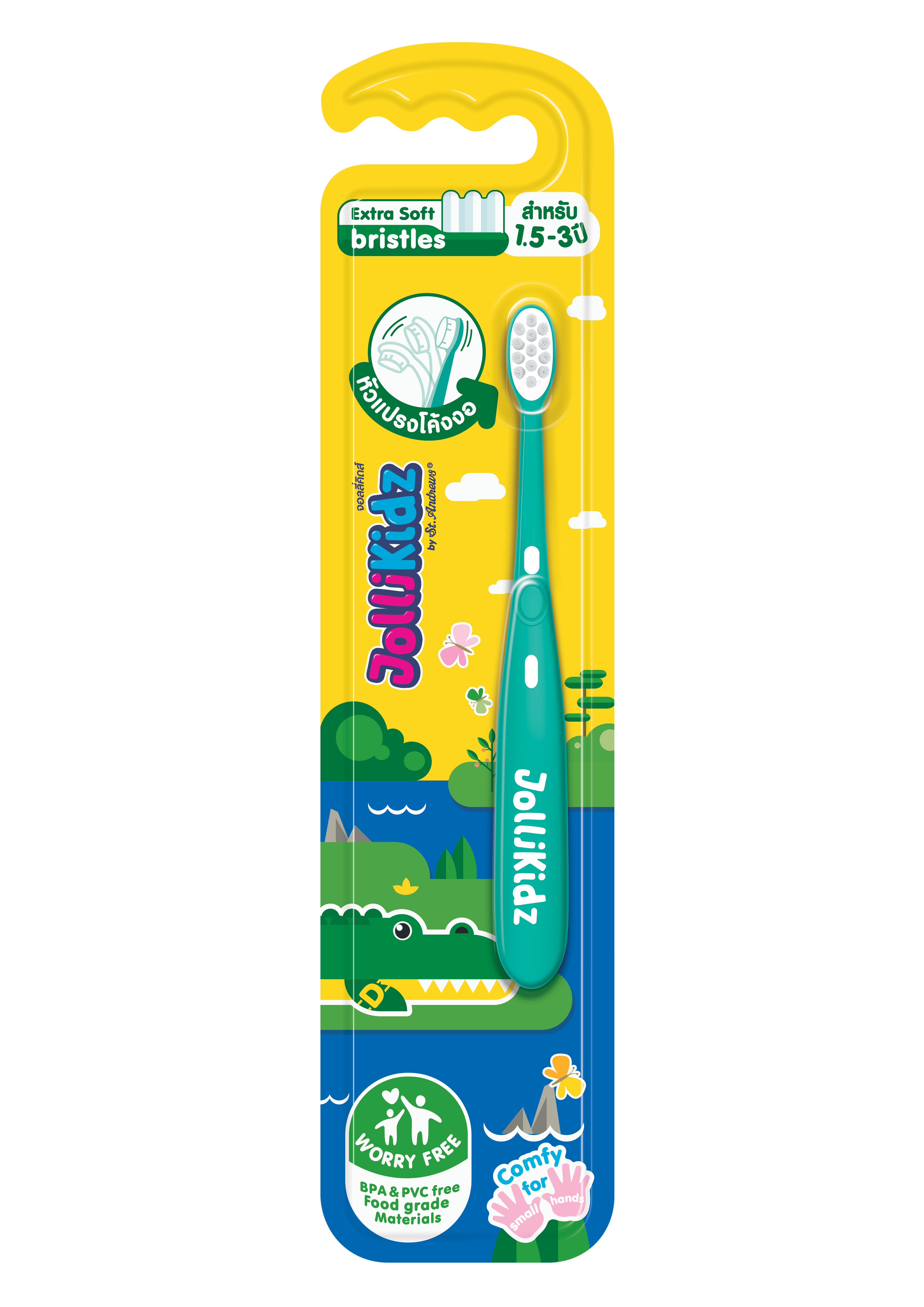 JolliKidz แปรงสีฟัน คอแปรงโค้งงอยืดหยุ่นสูง ทำความสะอาดได้ทุกซอกทุกมุม ป้องกันการกระแทกในช่องปากขณะแปรงฟัน ด้ามแปรงจับถนัด กระชับมือ ไม่ลื่นหลุด จากวัสดุ BPA & PVC Free Food Grade ยางซิลิโคน เด็กกัดได้ ปลอดภัย ตอบสนองพฤติกรรมเด็กที่ชอบกัดสิ่งของ
